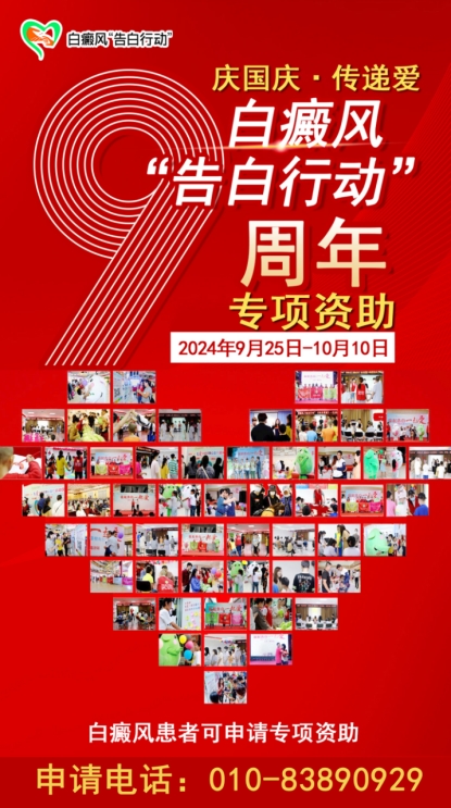 慶國慶·傳遞愛!白癜風(fēng)“告白行動”九周年專項資助全面啟動,白癜風(fēng)“告白行動”啟動以來,為白癜風(fēng)患者提供疾病救助,公益科普和心理援助等,已援助近千名白癜風(fēng)患者。為幫助更多的白癜風(fēng)患者早日康復(fù)。2024年9月25日-10月10日開展白癜風(fēng)患者專項資助活動,詳情電話:010-83890929。